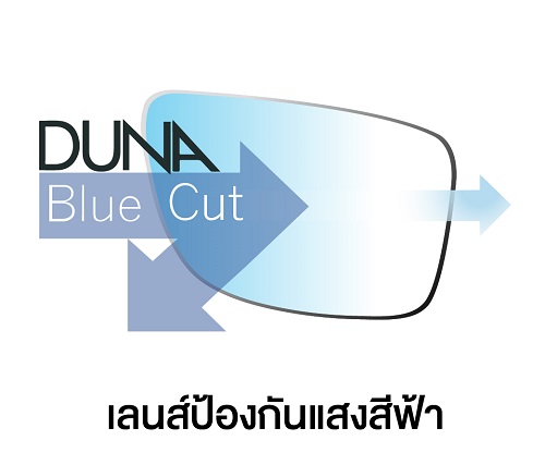 ดูน่าบลูคัท (DUNA BLUE CUT) เคลือบผิวเลนส์ด้วยเทคโนโลยีสะท้อนแสงสีฟ้าอมม่วง (Blue Light Reflection) พร้อมกรองรังสี UV ได้ถึง 400 nm. ช่วยให้มองเห็นได้สบายตามากขึ้นระหว่างใช้งานหน้าจอคอมพิวเตอร์หรืออุปกรณ์ดิจิทัลต่าง ๆ